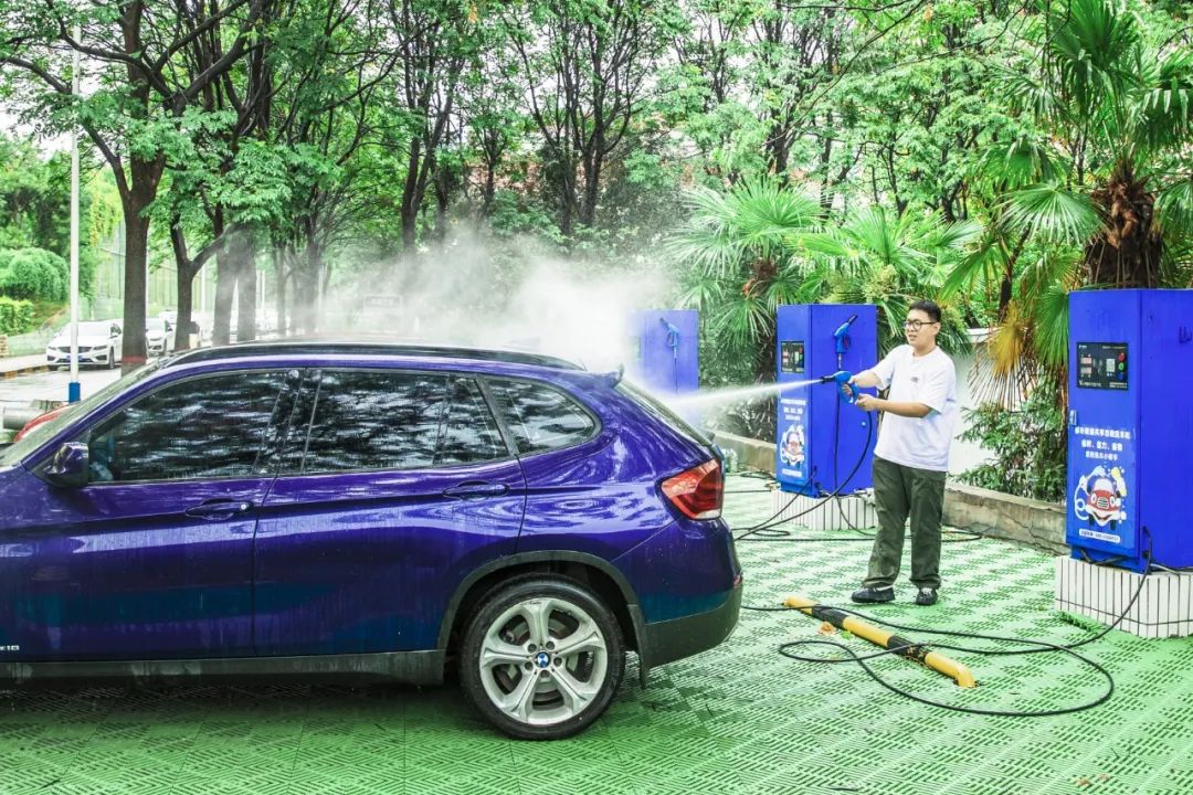 學(xué)校教職工在校園內(nèi)用共享自助洗車(chē)機(jī)清洗車(chē)輛
