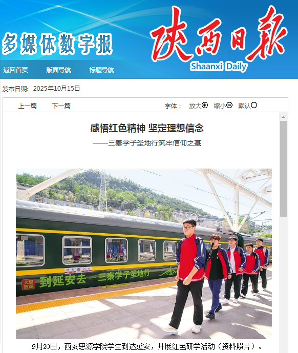 西安思源學(xué)院相關(guān)負(fù)責(zé)人說,學(xué)校將以此次研學(xué)為契機,幫助2025級新生在歷史與現(xiàn)實的交融中校準(zhǔn)人生坐標(biāo),探索出“思政課程與課程思政同向同行”的有效路徑,繼續(xù)深化“三全育人”綜合改革,將紅色基因融入育人全鏈條,讓延安精神滋養(yǎng)青年成長,培養(yǎng)擔(dān)當(dāng)民族復(fù)興大任的時代新人。