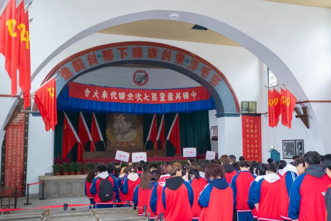研習(xí)營(yíng)師生在楊家?guī)X革命舊址參觀召開(kāi)中國(guó)共產(chǎn)黨七大的中央大禮堂
