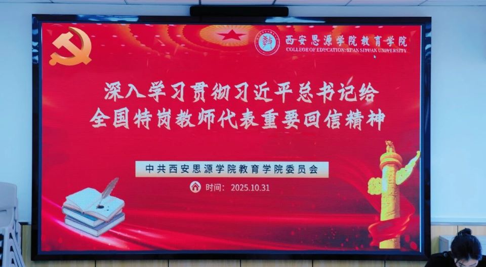 為深入學(xué)習(xí)貫徹習(xí)近平總書(shū)記給全國(guó)特崗教師代表重要回信精神,學(xué)習(xí)特崗教師投身鄉(xiāng)村教育事業(yè)、潛心耕耘、默默奉獻(xiàn)的擔(dān)當(dāng)與情懷。2025年10月31日,中共西安思源學(xué)院教育學(xué)院委員會(huì)在1號(hào)實(shí)驗(yàn)樓306教室召開(kāi)專(zhuān)題學(xué)習(xí)會(huì),集中學(xué)習(xí)習(xí)近平總書(shū)記給全國(guó)特崗教師代表重要回信精神。教育學(xué)院黨委書(shū)記、學(xué)管副院長(zhǎng)淡冰,教學(xué)副院長(zhǎng)陳婷婷,科研副院長(zhǎng)裴瑩,各系主任、黨委委員、黨支部書(shū)記、支部委員及教師代表參加會(huì)議。會(huì)議由教育學(xué)院黨委組織員王香主持。