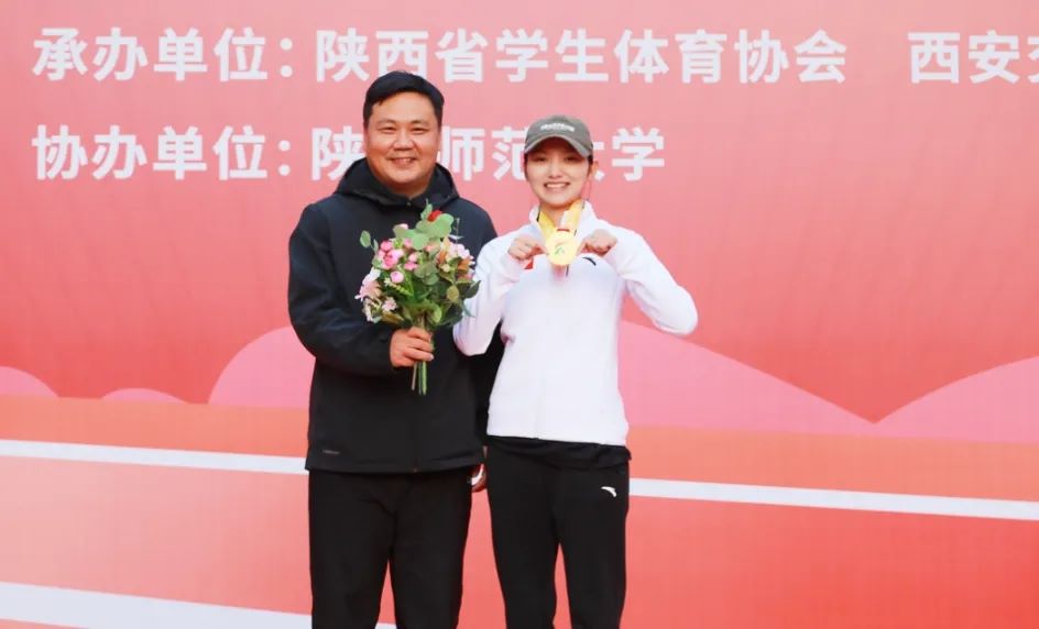大數(shù)據(jù)管理學(xué)院2024級市場營銷專業(yè)(專)學(xué)生王思敏(左)榮獲女子甲組鐵餅第一名,并打破該項目紀(jì)錄,與西安思源學(xué)院體育學(xué)院院長、田徑隊教練鐘華(右)合影留念